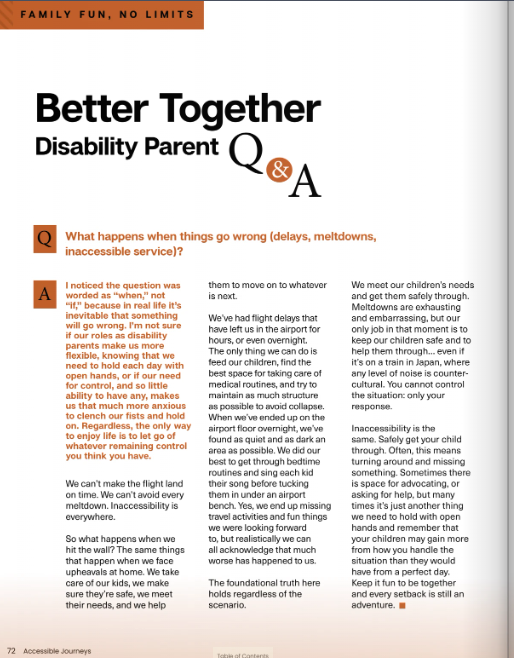 A: I noticed the question was worded as “when,” not “if,” because in real life it’s inevitable that something will go wrong. I’m not sure if our roles as disability parents make us more flexible, knowing that we need to hold each day with open hands, or if our need for control, and so little ability to have any, makes us that much more anxious to clench our fists and hold on. Regardless, the only way to enjoy life is to let go of whatever remaining control you think you have.