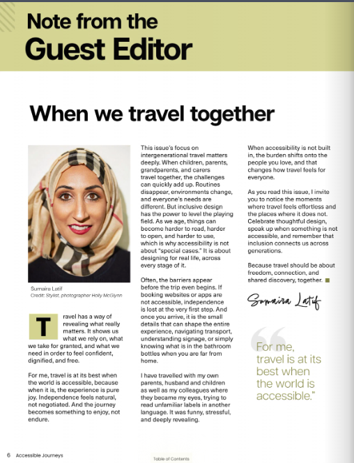 This issue’s focus on intergenerational travel matters deeply. When children, parents, grandparents, and carers travel together, the challenges can quickly add up. Routines disappear, environments change, and everyone’s needs are different. But inclusive design has the power to level the playing field. As we age, things can become harder to read, harder to open, and harder to use, which is why accessibility is not about “special cases.” It is about designing for real life, across every stage of it.