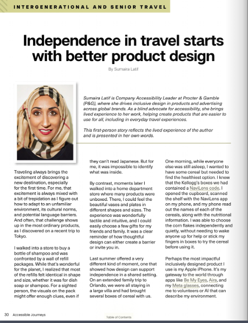 Sumaira Latif is Company Accessibility Leader at Procter & Gamble (P&G), where she drives inclusive design in products and advertising across global brands. As a blind advocate for accessibility, she brings lived experience to her work, helping create products that are easier to use for all, including in everyday travel experiences.