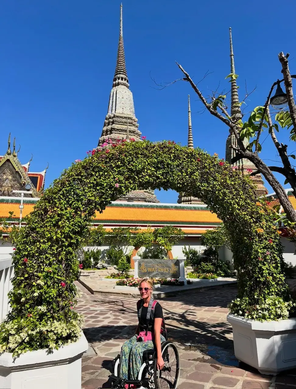 A woman in a wheelchair poses beneath a large, lush green floral archway in Thailand. In the background, the ornate, tiered white and gold spires of Wat Pho rise against a clear, deep blue sky.