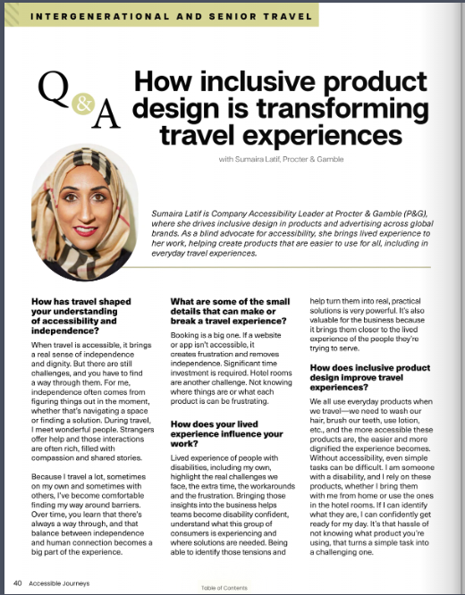 Sumaira Latif is Company Accessibility Leader at Procter & Gamble (P&G), where she drives inclusive design in products and advertising across global brands. As a blind advocate for accessibility, she brings lived experience to her work, helping create products that are easier to use for all, including in everyday travel experiences.