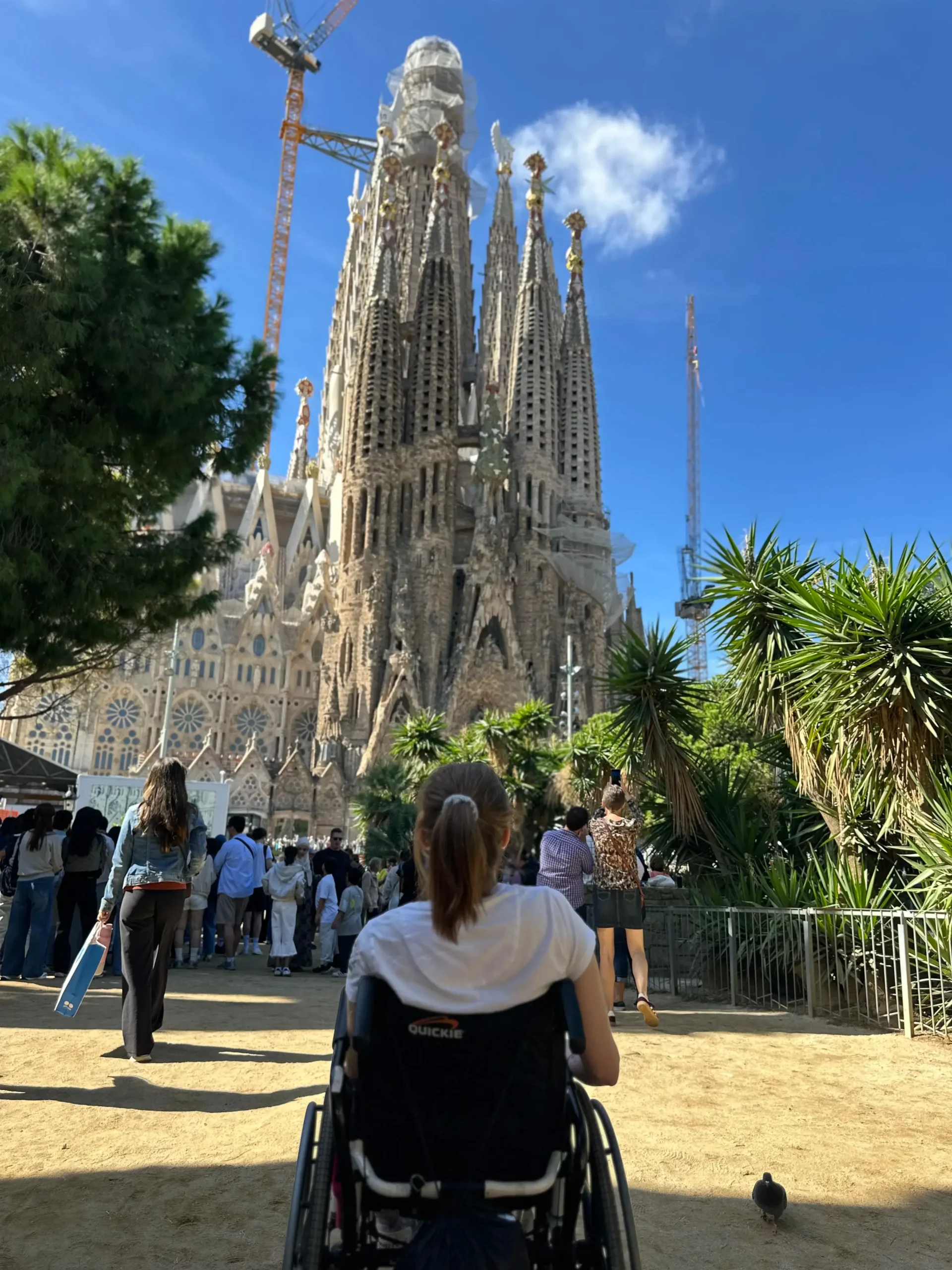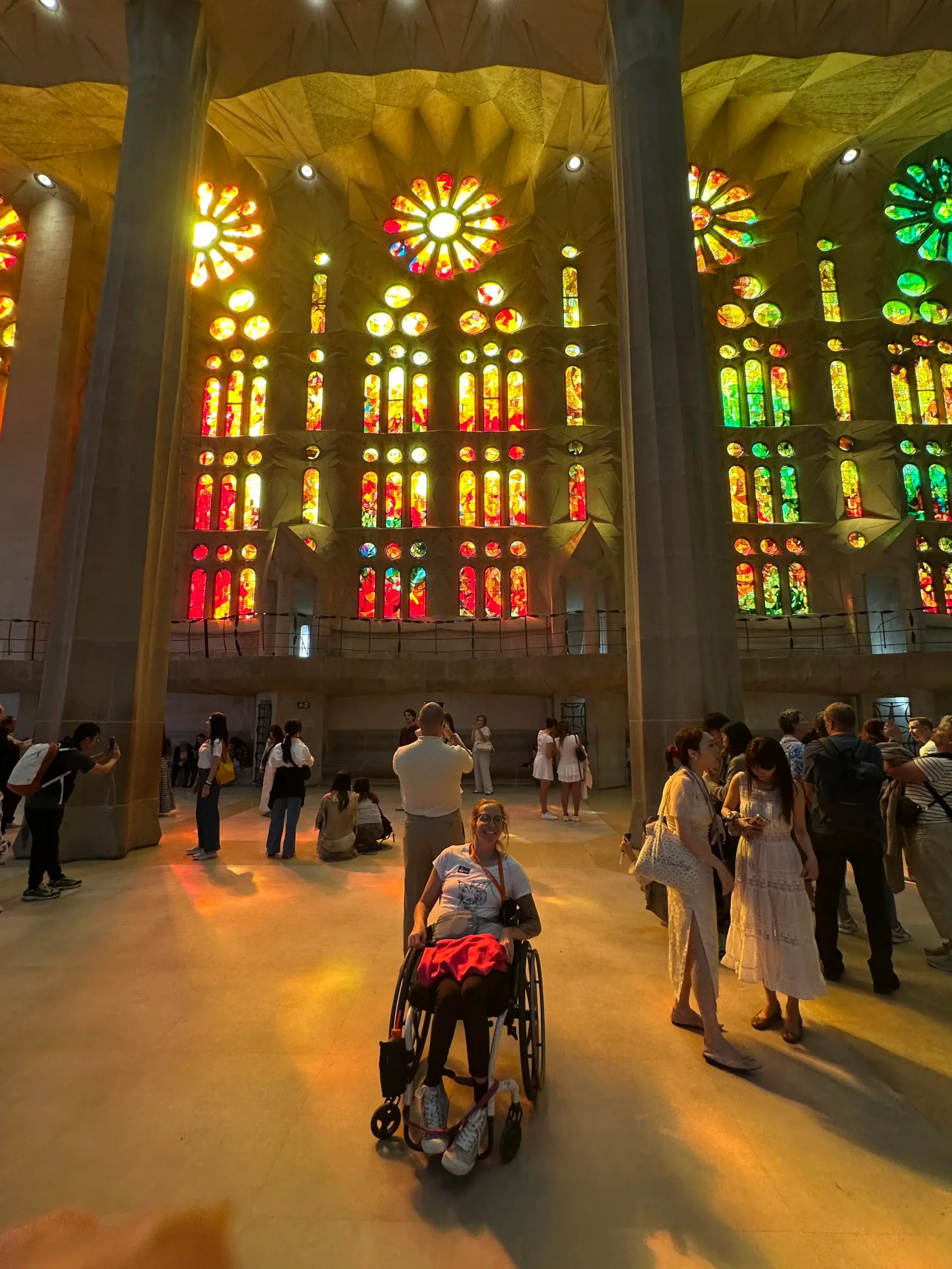 In Spain she visited a Roman amphitheatre in Tarragona with the Mediterranean right behind it. Her chair kept her from reaching the centre of the arena but standing above it with sea air rising around her felt powerful.